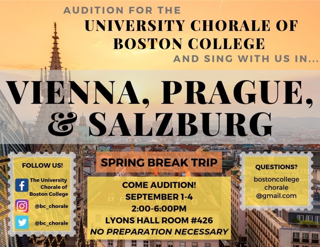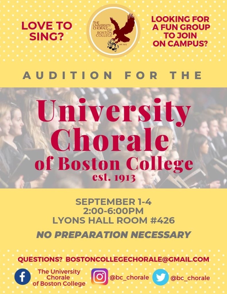 Welcome everyone! We are very excited to announce that auditions for the University Chorale of Boston College will take place September 1st-4th in Lyons Hall, room #426. Each day, auditions will run from 2:00pm-6:00pm, and there is no preparation necessary to audition. We are looking forward to seeing everyone there!
