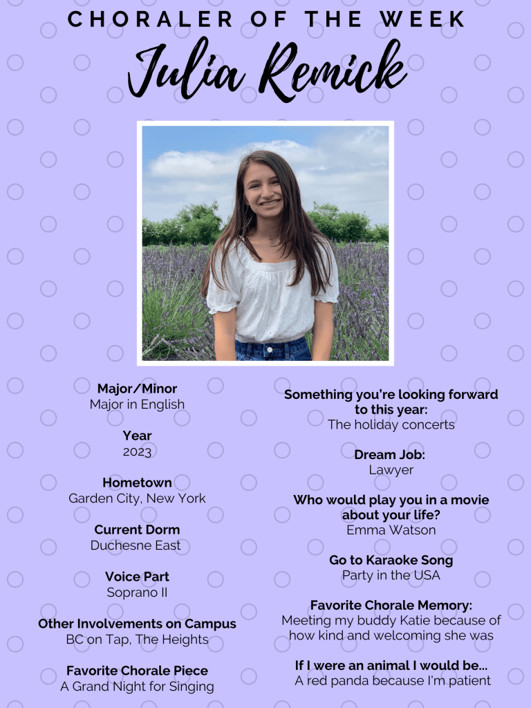 It’s time to meet our next Choraler of the Week, our very own freshman Julia Remick! Find out about her dream job, her go-to karaoke song, and her other BC involvements in the poster below!