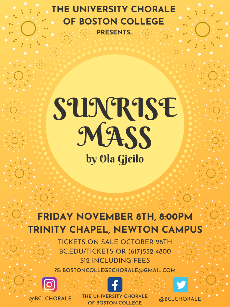 Tickets for our Fall Concert featuring “Sunrise Mass” by Ola Gjeilo and “Magnificat” by Francesco Durante are on sale TODAY! Head to bc.edu/tickets now to purchase your tickets! Tickets are $12 altogether, which includes a $2 processing fee. Please email Maggie Lane, director of marketing and management, at lanemv@bc.edu with any questions.