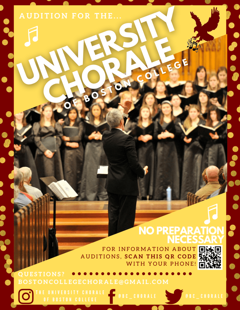 Welcome! Thank you for your interest in the University Chorale of Boston College. We are thrilled that you want to become a part of our organization and we can’t wait to hear you sing. Despite the many challenges that this year has thrown at us, the University Chorale is dedicated to finding unique and innovative ways to keep our student body singing. When you audition for the Chorale, you are auditioning for a group of singers who care deeply about their instrument, the mission to spread music, and each other.
