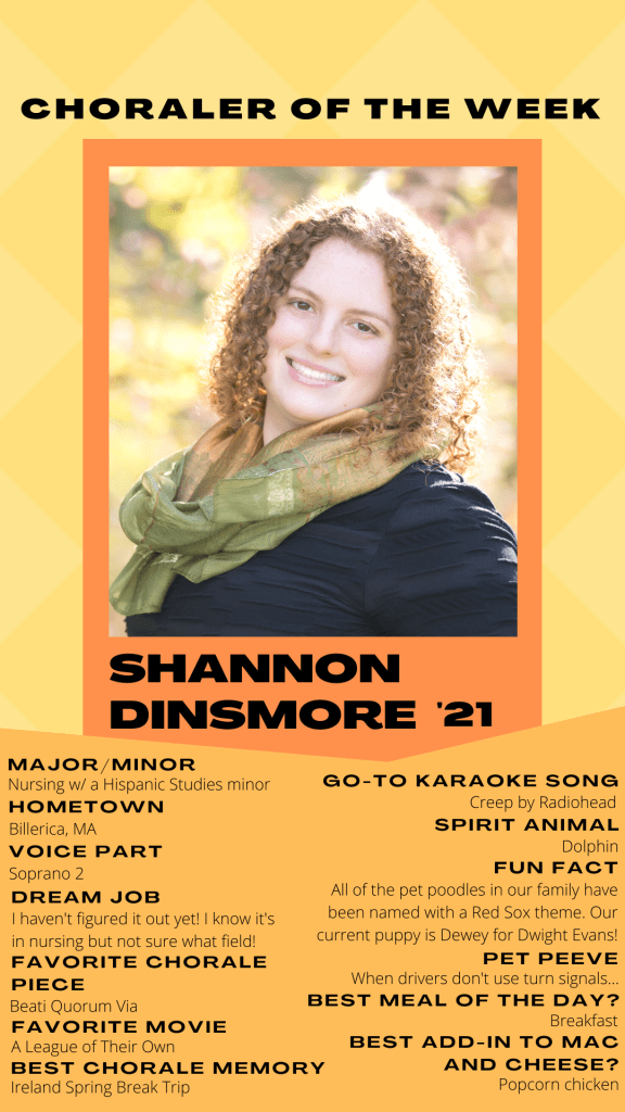 AnnouncementsMeet this week’s “Choraler of the Week,” Shannon Dinsmore! 10/08/202010/22/2020 beckpat22 Meet our next COTW, senior Shannon Dinsmore! Read all about her favorite chorale piece, her go-to karaoke song, her pet peeve, and more in the poster below! Design by Talia Kaplanian ’22, Director of Publicity Like Loading... Published by beckpat22 View all posts by beckpat22