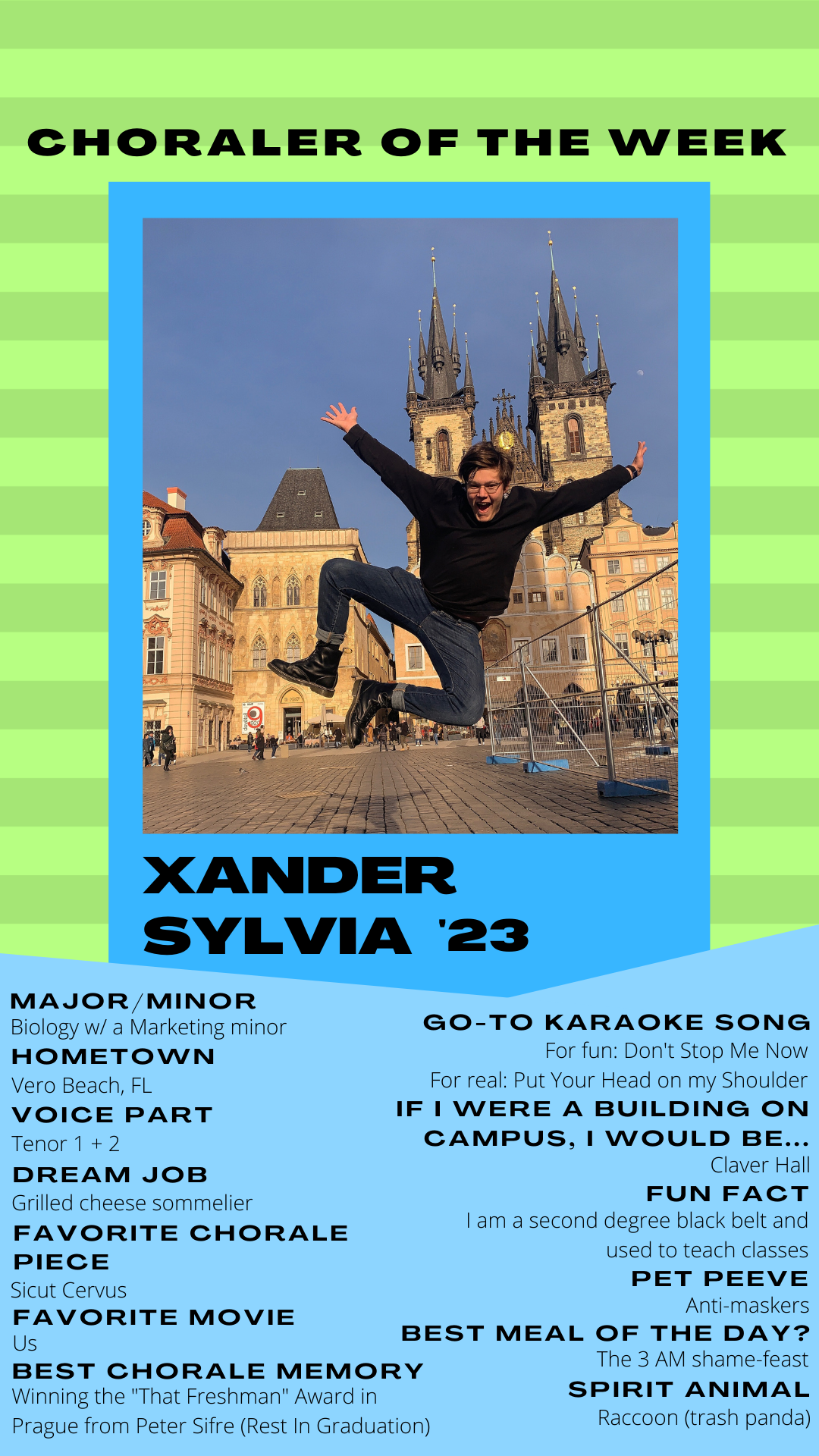 AnnouncementsMeet this week’s “Choraler of the Week,” Xander Sylvia! 10/15/202010/22/2020 beckpat22 Meet our next COTW, sophomore Xander Sylvia! Read all about his favorite chorale piece, his favorite meal of the day, his best chorale memory, and more in the poster below! Design by Talia Kaplanian ’22, Director of Publicity Like Loading... Published by beckpat22 View all posts by beckpat22