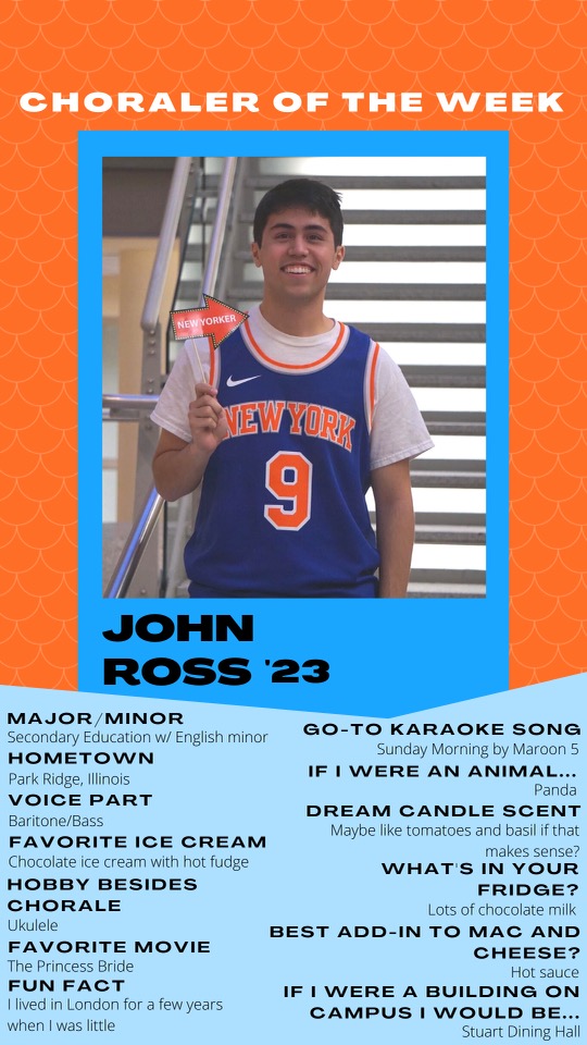 AnnouncementsMeet this week’s “Choraler of the Week,” John Ross! 11/12/202011/12/2020 beckpat22 Meet our next COTW, sophomore John Ross! Read all about his fun fact, his go-to karaoke song, his dream candle scent, and more in the poster below! Design by Talia Kaplanian ’22, Director of Publicity Like Loading... Published by beckpat22 View all posts by beckpat22