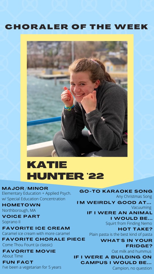 AnnouncementsMeet this week’s “Choraler of the Week,” Katie Hunter! 11/19/202011/19/2020 beckpat22 Meet our next COTW, junior Katie Hunter! Read all about her favorite chorale piece, her weird talent, her hottest take, and more in the poster below! Design by Talia Kaplanian ’22, Director of Publicity Like Loading... Published by beckpat22 View all posts by beckpat22
