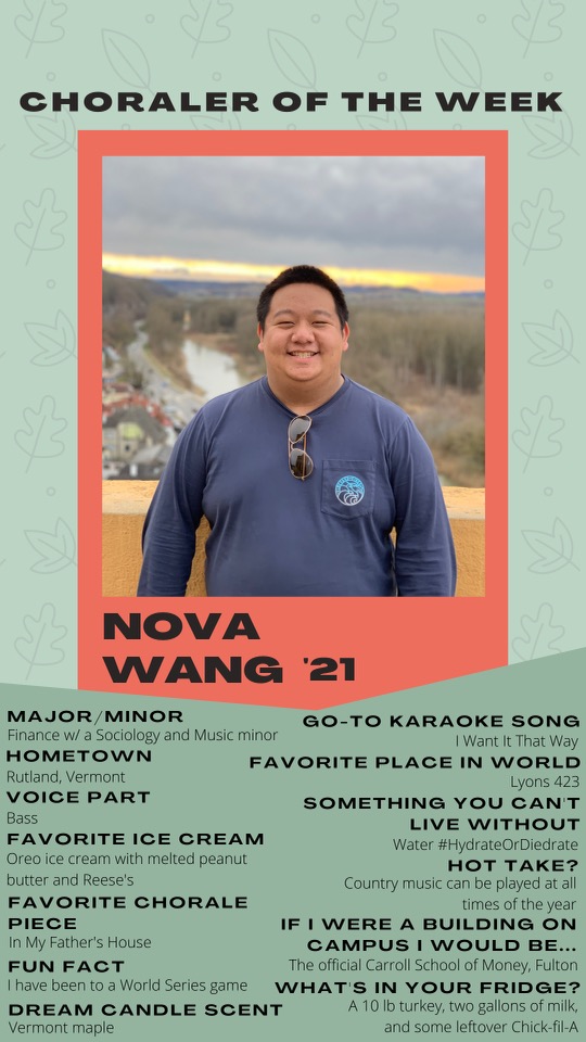 Happy Thanksgiving from the University Chorale! Meet our next COTW, senior and Vice President Nova Wang! Read all about his dream candle scent, his go-to karaoke song, the contents of his fridge, and more in the poster below!