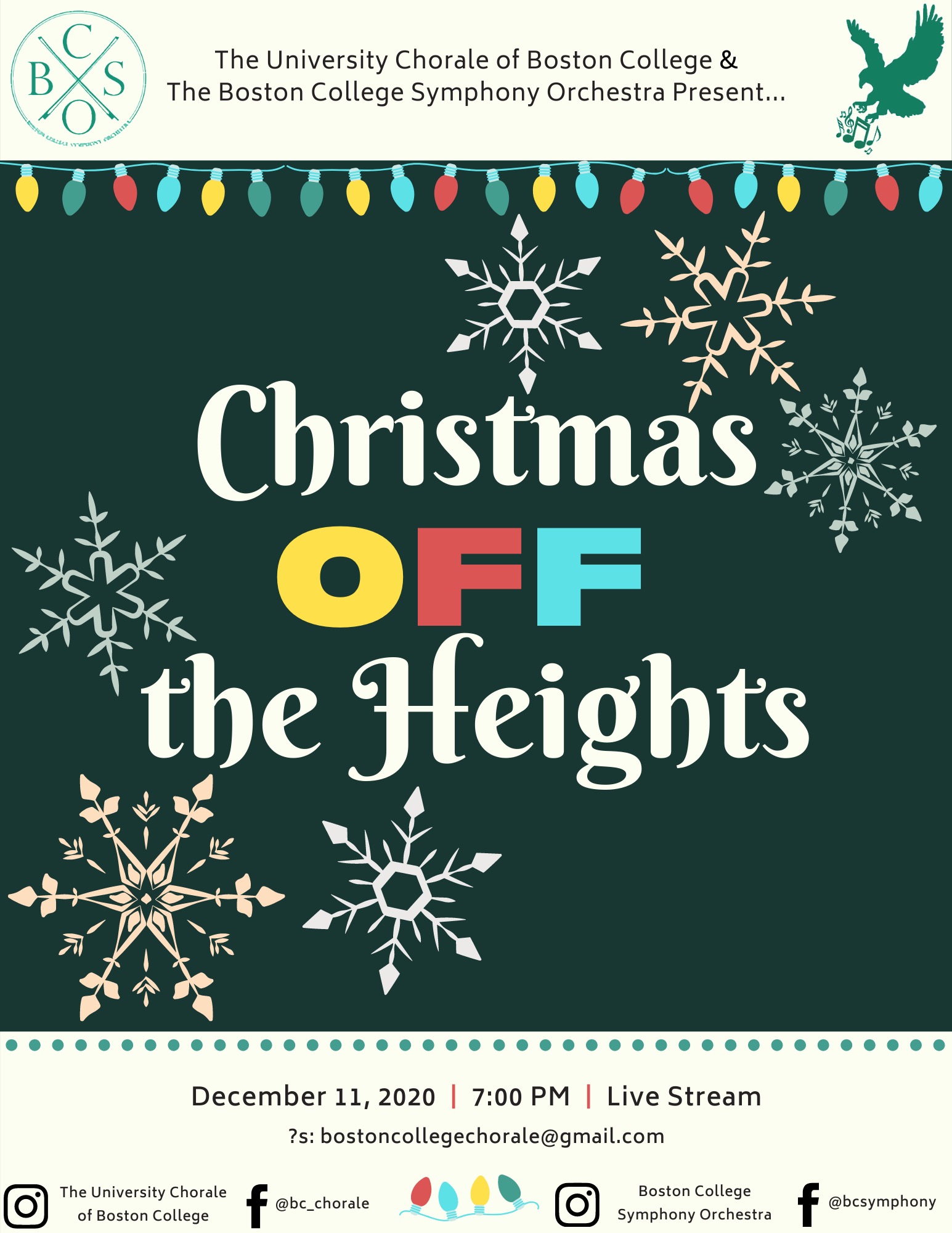 Mark your calendars! The University Chorale of Boston College and the Boston College Symphony Orchestra are proud to present our Christmas Off The Heights concert, featuring virtual performances by this year’s Chorale and Orchestra as well as recordings from past concerts! We invite you to join us on Friday, December 11th at 7:00 pm EST to help us spread Christmas cheer with an evening of beautiful music!