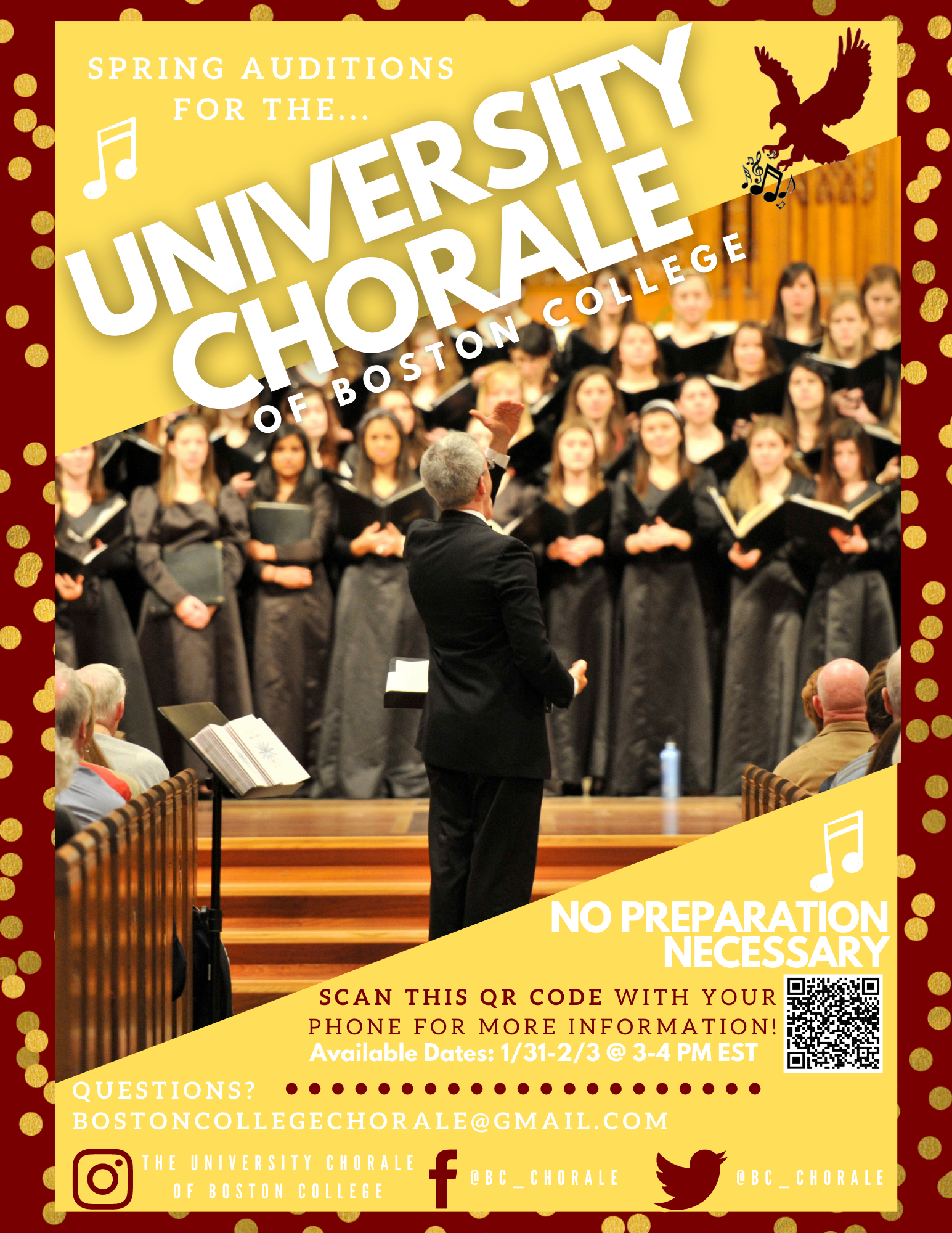 To comply with Massachusetts state guidelines and University social distancing policies, all auditions will be held virtually via Zoom. We will be holding auditions during the first two weeks of classes. To learn more, check out the Auditions page, where you can find all of the resources you need for the audition process. If you have any questions, feel free to contact us at bostoncollegechorale@gmail.com. We can’t wait to welcome you into our amazing family on campus! See you on Zoom!
