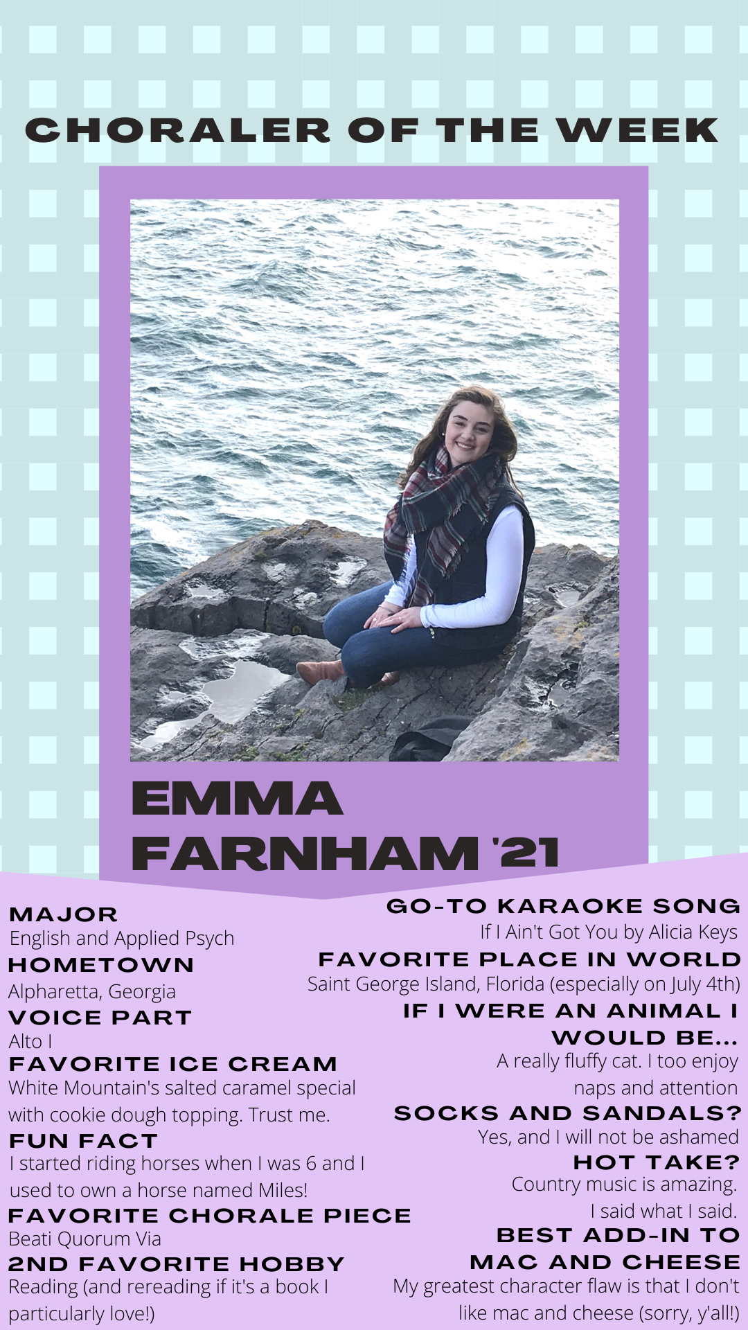 AnnouncementsMeet this week’s “Choraler of the Week,” Emma Farnham! 02/11/202102/11/2021 beckpat22 Meet our next COTW, Social Director Emma Farnham! Read all about her favorite place, her favorite piece, her blasphemous opinions on mac and cheese, and more in the poster below! Design by Talia Kaplanian ’22, Director of Publicity Like Loading... Published by beckpat22 View all posts by beckpat22