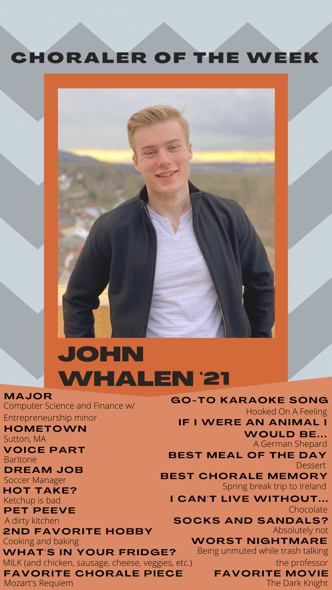 AnnouncementsMeet this week’s “Choraler of the Week,” John Whalen! 03/04/2021 beckpat22 Meet our next COTW, Tenor/Bass Secretary John Whalen! Read all about his pet peeve, his favorite chorale memory, his opinions on socks and sandals, and more in the poster below! Design by Talia Kaplanian ’22, Director of Publicity Like Loading... Published by beckpat22 View all posts by beckpat22
