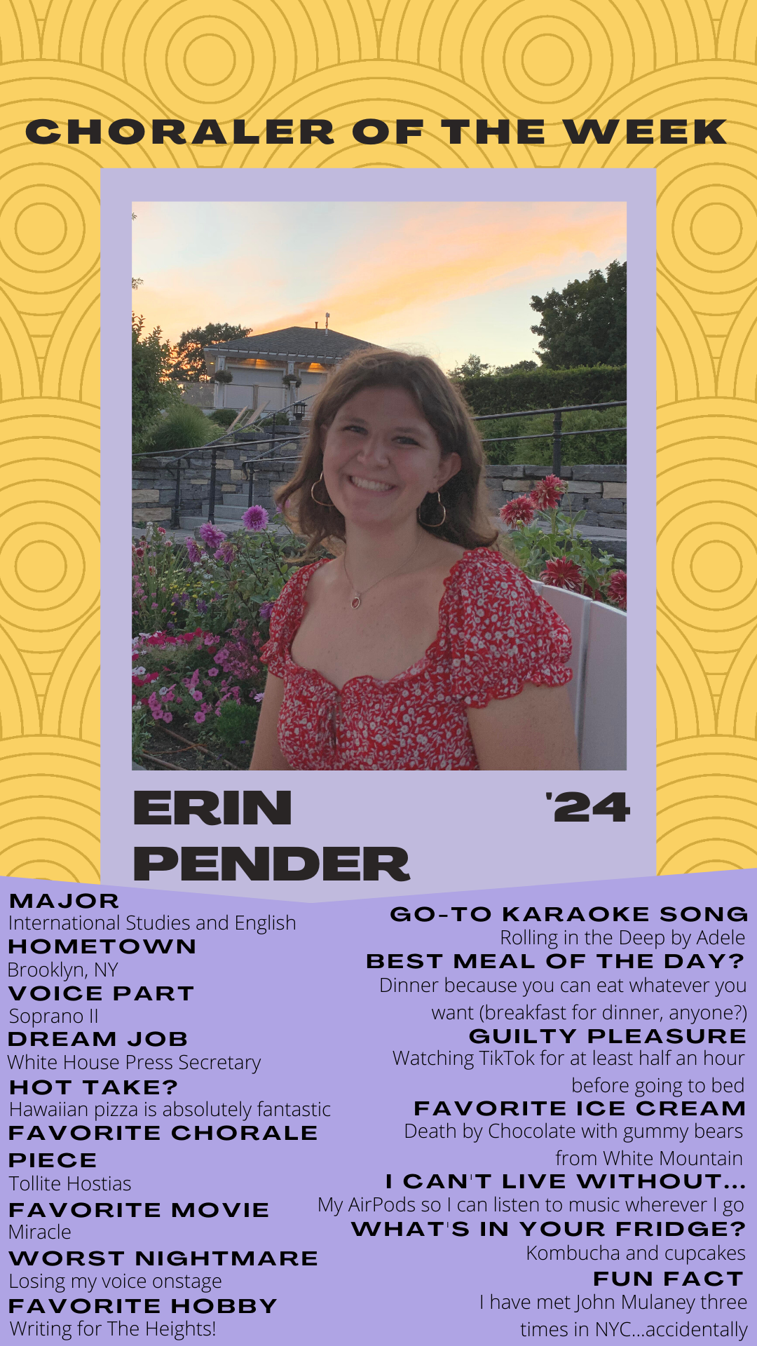 AnnouncementsMeet this week’s “Choraler of the Week,” Erin Pender! 04/22/202104/22/2021 beckpat22 Meet our next COTW, freshman Erin Pender! Read all about her guilty pleasure, her worst nightmare, the contents of her fridge, and more in the poster below! Design by Talia Kaplanian ’22, Director of Publicity Like Loading... Published by beckpat22 View all posts by beckpat22