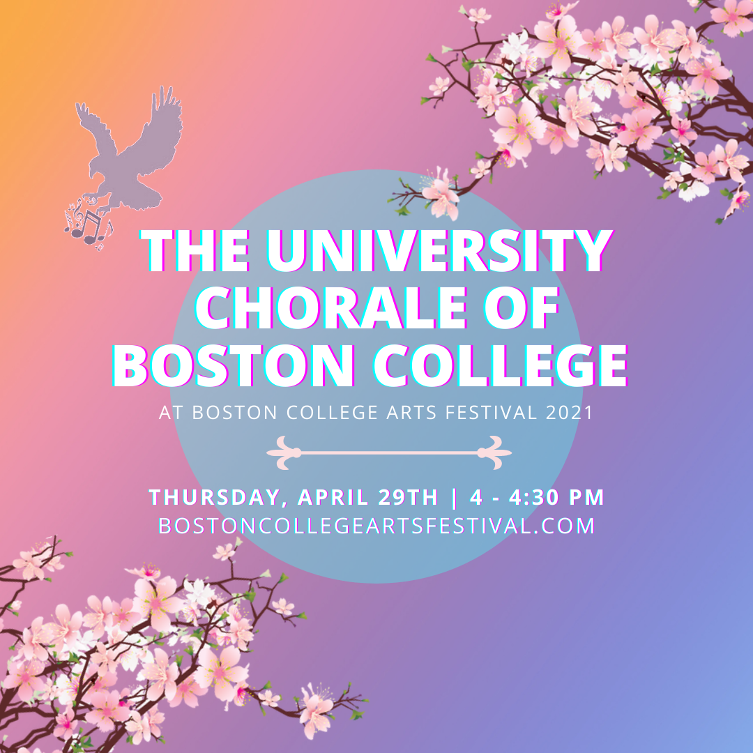 What will you be singing? This year, we’ll be showing a collection of some of our virtual recordings over the past year, including Boston College favorites like For Boston, selections from the Chamber Singers of the University Chorale, and our special rendition of “Tollite Hostias” recorded by current and former Chorale members in May 2020!