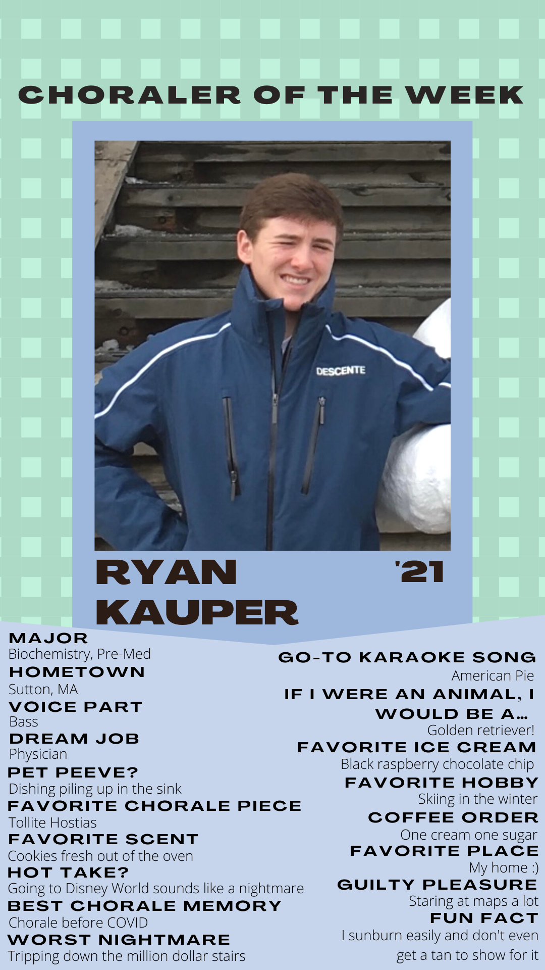 AnnouncementsMeet this week’s “Choraler of the Week,” Ryan Kauper! 04/29/202105/03/2021 beckpat22 Meet our next COTW, senior Ryan Kauper! Read all about his favorite scent, his best chorale memory, his guilty pleasure, and more in the poster below! Design by Talia Kaplanian ’22, Director of Publicity Like Loading... Published by beckpat22 View all posts by beckpat22