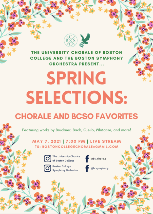 Mark your calendars! The University Chorale of Boston College and the Boston College Symphony Orchestra are proud to present this year’s Spring Selections, featuring some of our favorite works performed by the University Chorale, The Chamber Singers, and The Boston College Symphony Orchestra! We invite you to join us on Friday, May 7th at 7:00 pm EST to help us celebrate the end of the academic year with an evening of beautiful music!