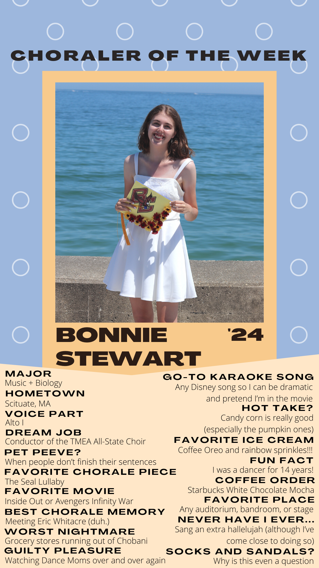 AnnouncementsMeet this week’s “Choraler of the Week,” Bonnie Stewart! 05/06/202105/03/2021 beckpat22 Meet our next COTW, freshman Bonnie Stewart! Read all about her coffee order, her favorite chorale memory, her hottest take, and more in the poster below! Design by Talia Kaplanian ’22, Director of Publicity Like Loading... Published by beckpat22 View all posts by beckpat22