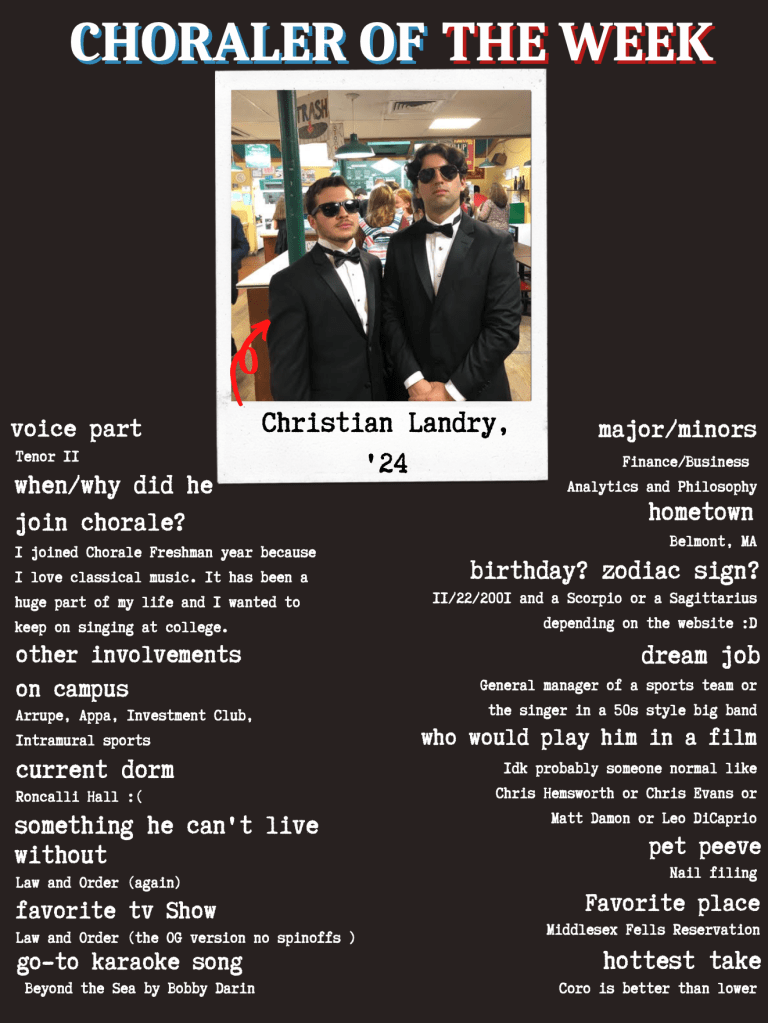 AnnouncementsMeet this week’s “Choraler of the Week,” Christian Landry! 10/28/202110/28/2021 kitzryan Meet this week’s COTW, Sophomore Christian Landry! Learn about his birthday, dream job, and more by reading the poster below! Like Loading... Published by kitzryan View all posts by kitzryan