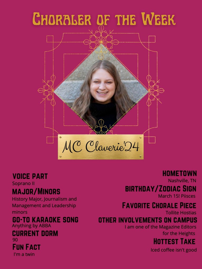 AnnouncementsMeet this week’s “Choraler of the Week,” MC Claverie! 11/04/202111/04/2021 kitzryan Meet this week’s COTW, Sophomore MC Claverie! Learn about her majors and minors, favorite chorale piece, and more by reading the poster below! Like Loading... Published by kitzryan View all posts by kitzryan